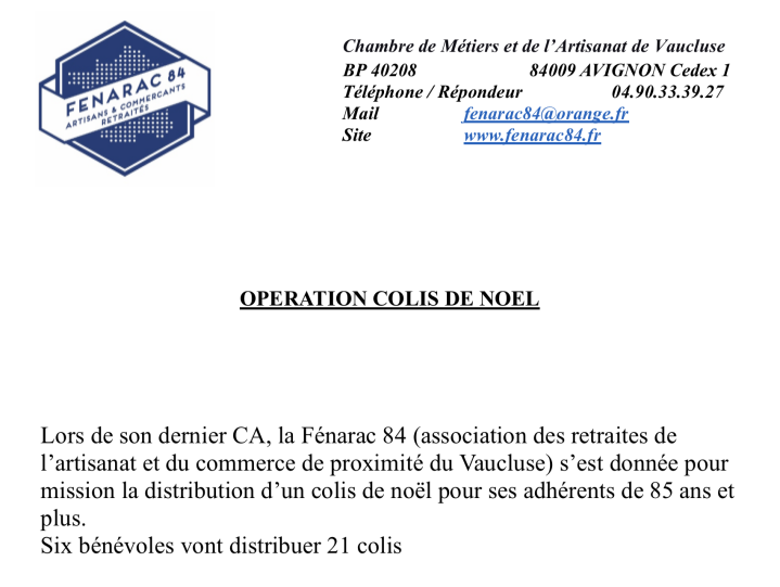 En décembre, pour la deuxième année consécutive, la Fénarac 84 a réalisé son opération « colis de noël » 11 bénévoles ont distribué 27 colis